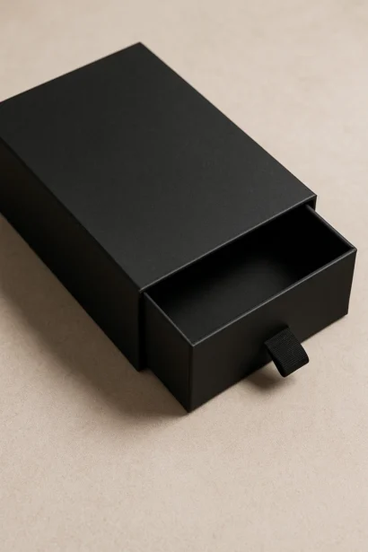 Sleek and modern, our black matte drawer boxes deliver a bold visual impact—ideal for high-end branding and designer product packaging.…Custom Printed Drawer Boxes