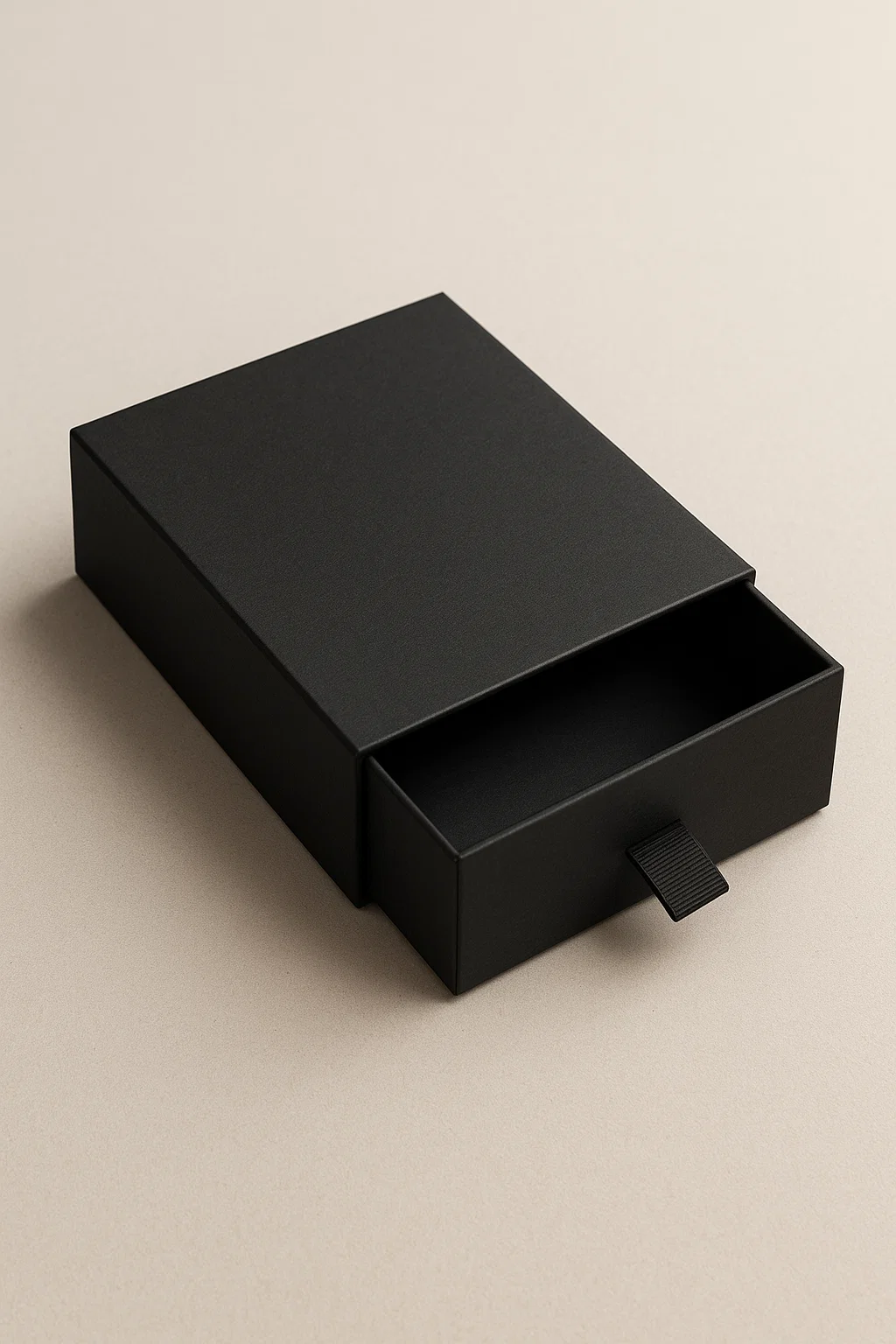 Black matte drawer boxes are a type of rigid box that feature a sliding drawer compartment housed inside an outer sleeve. Often referred to as “slide boxes” or “matchbox-style boxes,” they offer a secure and aesthetically pleasing way to package and present high-value products. The matte black finish adds a luxurious, minimalist look that complements both modern and classic branding styles.