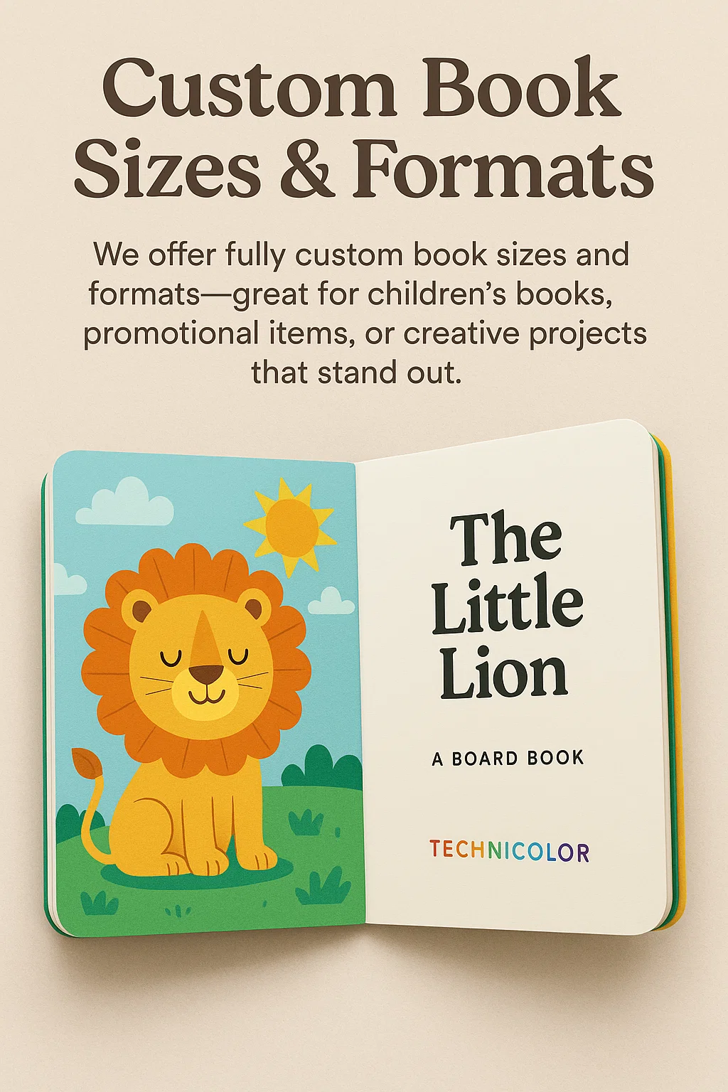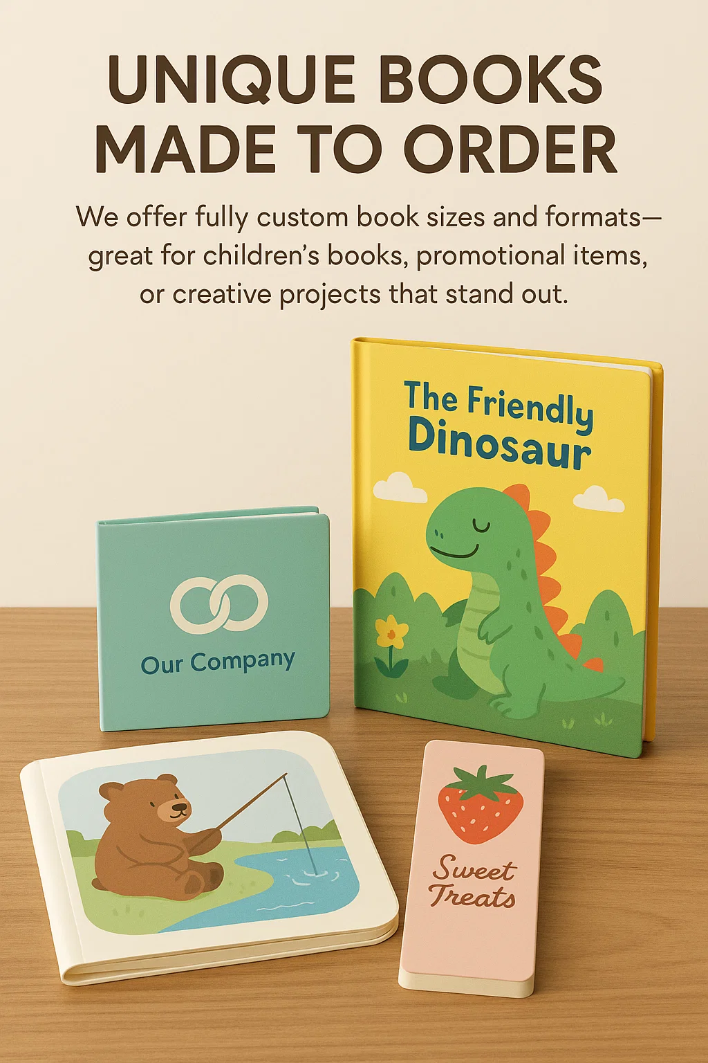 Looking for something unique We offer fully custom book sizes and formats—great for children’s books, promotional items, or creative projects that stand out.
